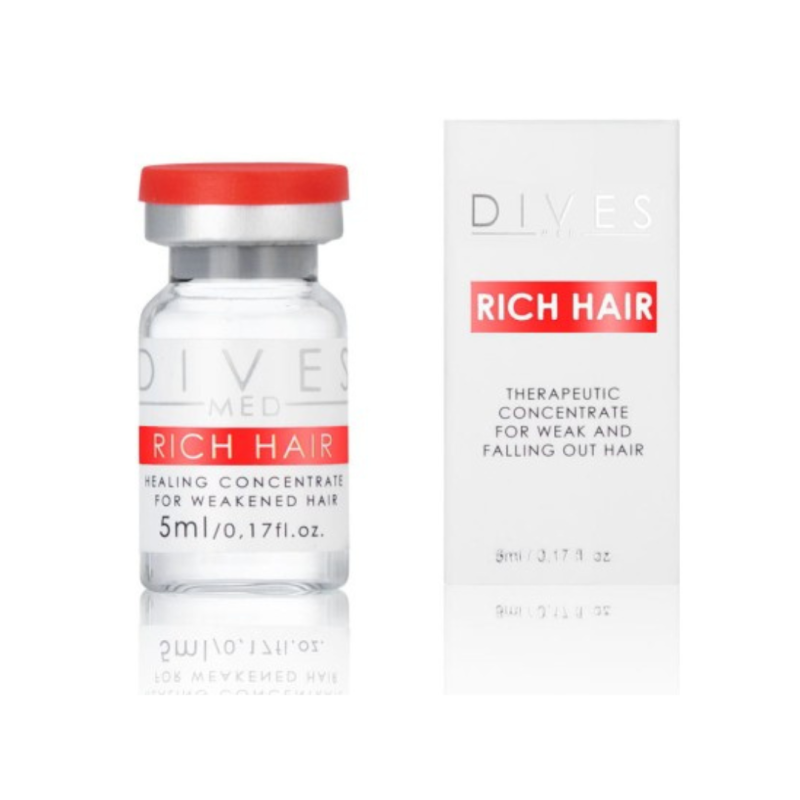 Dives med. Rich Hair to niepowtarzalny kompleks 26 składników o szerokim spektrum działania zalecany do zabiegów na owłosiona skórę głowy. Działanie preparatu oparte jest na połączeniu peptydów biomimetycznych z czynnikami wzrostu, witaminami, minerałami i aminokwasami. Rich Hair zapobiega nadmiernej utracie włosów oraz stymuluje ich porost poprzez wydłużenie fazy anagenu. Obecność peptydów biomimetycznych zapewnia wysoką efektywność i terapię celowaną na wszystkie problemy występujące w obrębie skóry głowy. Rich hair leczy łysienie androgenowe, alopecję (łysienie plackowate) czy przerzedzenie włosów wynikające z chorób, starzenia się czy niekorzystnego wpływu czynników zewnętrznych.